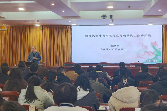 本网讯(通讯员 骆夏君 李诺)为加强辅导员队伍建设,提升育人实效,12月3日,学校“学思讲堂”第十五期特邀“时代楷模”“全国师德标兵”大连海事大学曲建武教授作专题报告。曲教授以《新时代辅导员角色定位与辅导员工作的开展》为题,为我校学生工作队伍带来精彩分享。